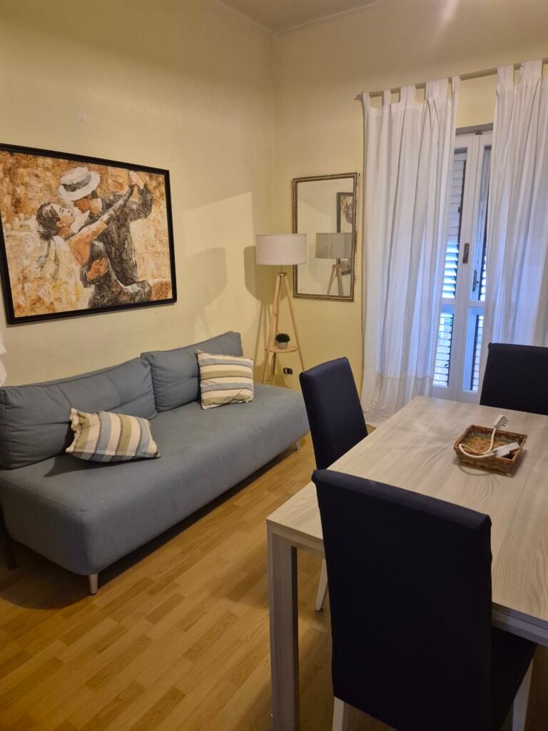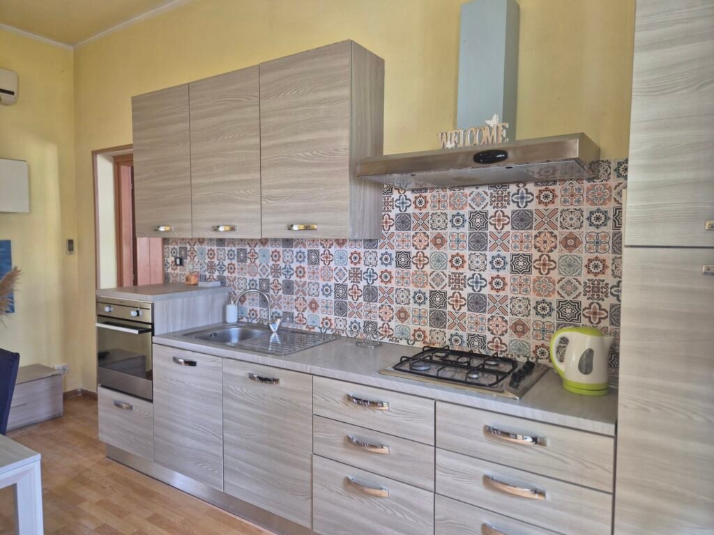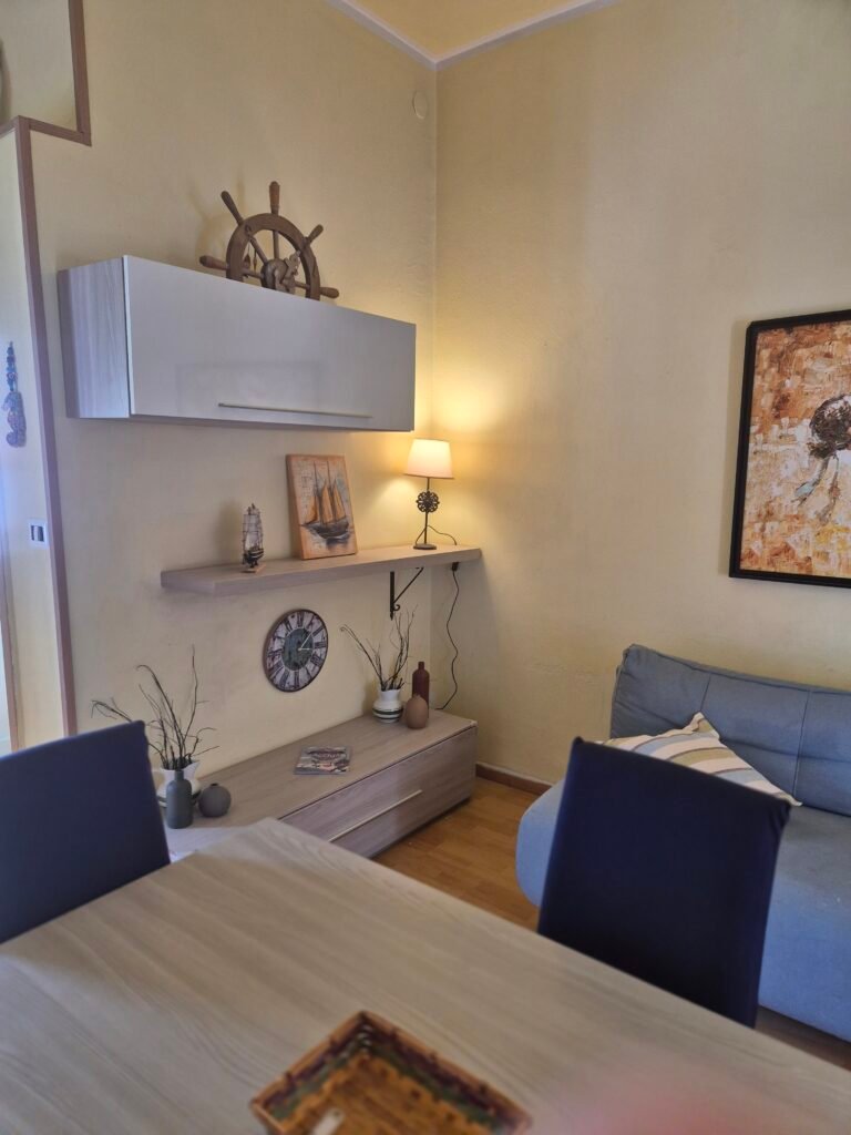 L’appartamento è composto da una stanza da letto matrimoniale, ampio bagno, soggiorno con ampia cucina e divano letto, super terrazzo panoramicissimo di 50 Mq con tavoli e lettini in legno. Cucina super accessoriata completa di pentole piatti e bicchieri.